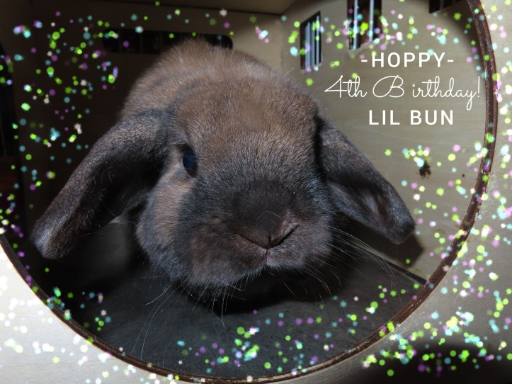 Lil Bun Holland Lop turned 4 years old on February 14th! He is the sweetest bun. He enjoys sitting in kids lap and being held but not so much being brushed. He really missed Poppy the first several weeks. I expanded his floor cage to include hers and left her nesting box in there for him. He has adapted and loves the extra space now for his zoomies.